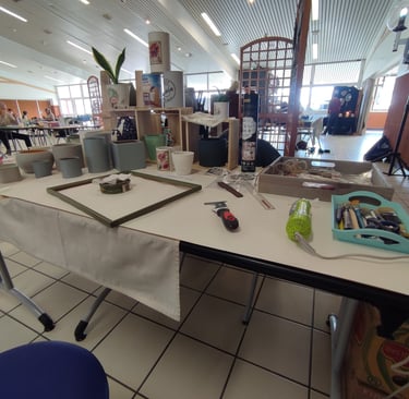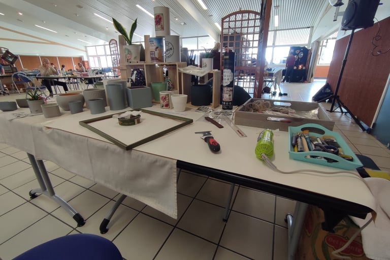 De la préparation d'un objet (boîte, lampe, vase, cadre) à la finition, en passant par la mise en peinture et des effets divers : des applications de pochoirs ou transferts, des patines, etc... Il y a d'autres ateliers prévus pour découvrir la couture, le tricot, le cartonnage, etc... Novice ou confirmé, chacun trouvera sa place selon son projet, dans la joie et la bonne humeur ! L'idée étant d'apprendre de chacun et de partager de bons moments !